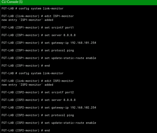 config system link-monitor edit ISP-1-monitor set srcintf port1 set server 8.8.8.8 set gateway-ip 103.10.10.1 set protocol ping set update-static-route enable end